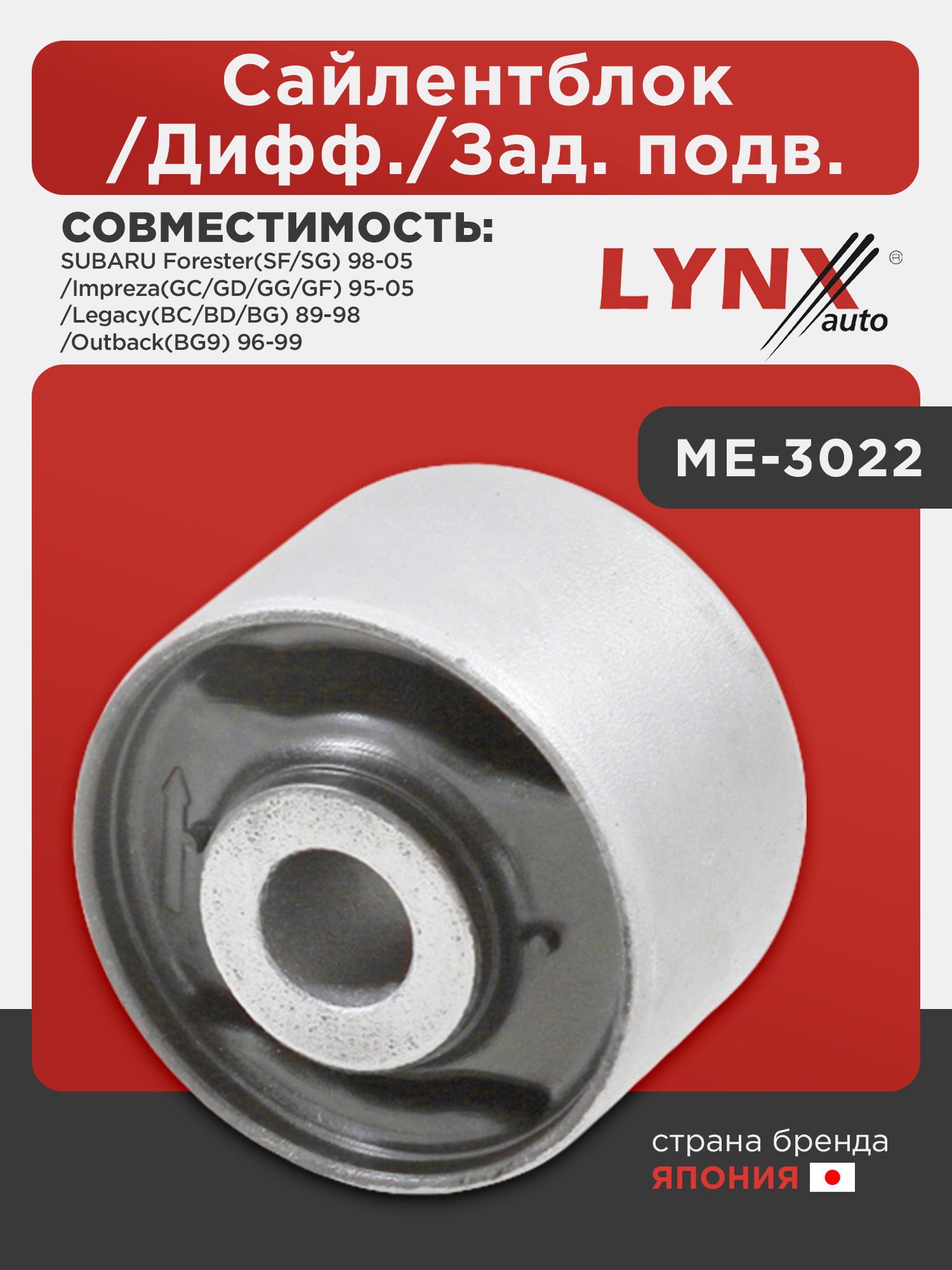Сайлентблок/Дифф./Зад. подв. LYNXauto ME-3022. Для SUBARU Субару Forester(Форестер)(SF/SG) 98-05/Impreza(Импреза)(GC/GD/GG/GF) 95-05/Legacy(Легаси)(BC/BD/BG) 89-98/Outback(Аутбэк)(BG9) 96-99