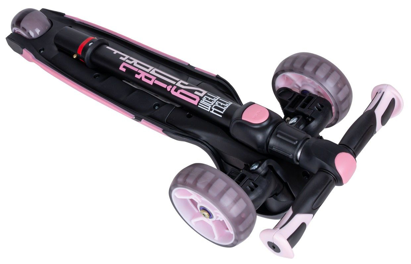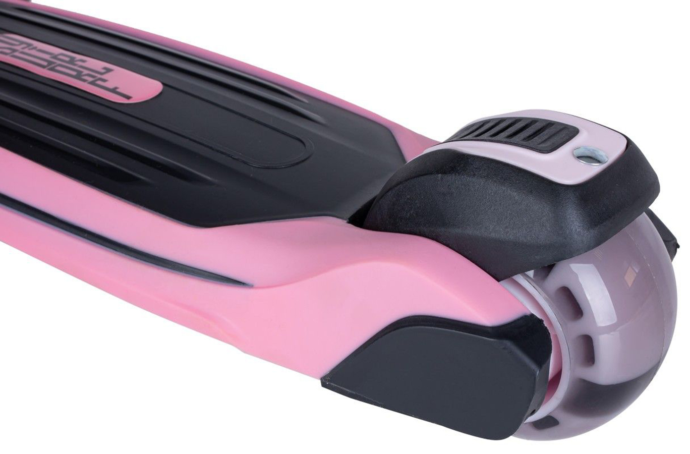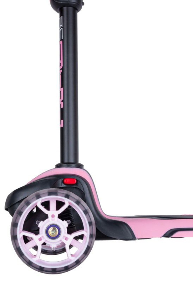 Колеса самоката широкие, выполнены из прочной пластмассы со специальным полиуретановым покрытием, обеспечивающим в совокупности с подшипниками стандарта ABEC 9, хорошие накат и амортизацию. Размер передних колес 120х40 мм, заднего - 80х50 мм. Заднее колесо оснащено крылом-тормозом. Все колеса самоката имеют так любимую детьми светодиодную подсветку, которая запускается при движении. Особенность подсветки в том, что благодаря применению прозрачного полиуретана в конструкции колес ребенок хорошо видит свечение.