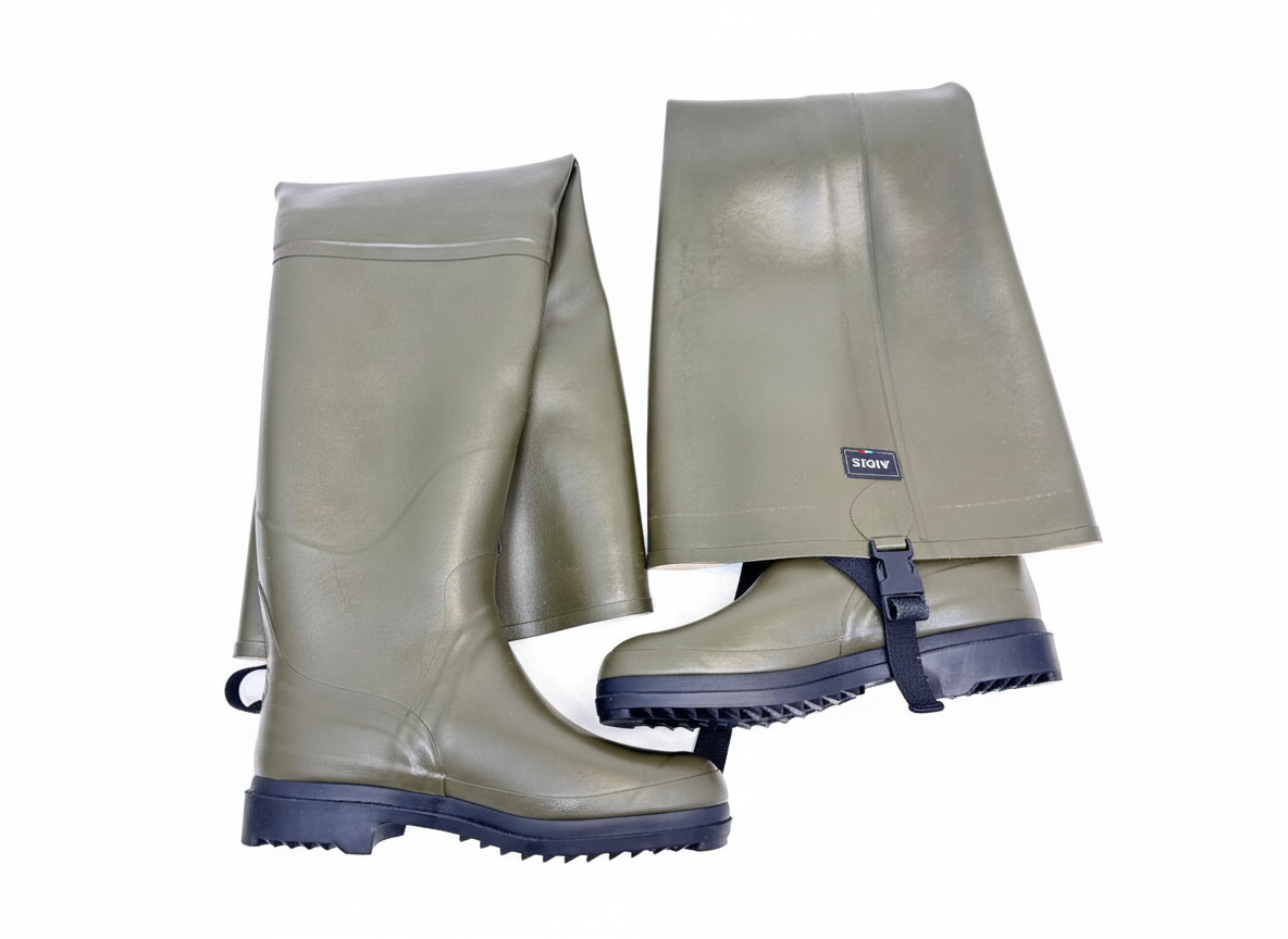 Высокие (до бёдер) болотные сапоги из натурального каучука. Верхняя часть сапог сделана менее толстой, что обеспечивает дополнительную лёгкость при ходьбе без потери прочности. Подошва изготовлена из смеси каучука и полимера - это увеличивает эластичность и износостойкость. Внутри синтетический материал (быстросохнущий) со специальной антибактериальной пропиткой против образования плесени, и неприятного запаха внутри сапога(который свойственен большинству аналогов). Специальный съёмный ремешок позволяет фиксировать сапог (Вы можете пристегнуть его к одежде или ремню).