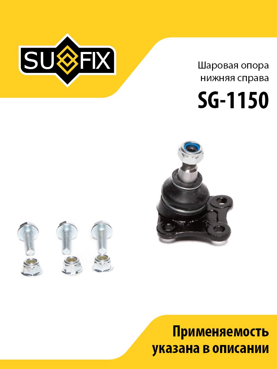 Шаровая опора нижняя R SUFIX SG-1150. Применение: AUDI A3(8L1) 1.6-1.9TD 96>, SKODA Octavia(1U2) 1.4-2.0 99>, VW Bora 1.4-2.8 98-05 / Golf IV 1.6-3.2 97-05 / New Beetle 1.4-3.2 99>.