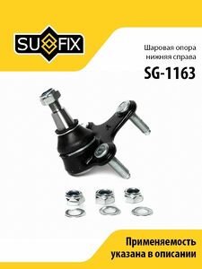 Шаровая опора нижняя R SUFIX SG-1163. Применение: AUDI A3(8V) 1.2T-2.0D 12>, SKODA Octavia(5E) 1.2T-2.0 12>, VW Golf VII 1.2T-2.0 12> / Passat 1.4T-3.6 05> / Sharan 1.4T-2.0 10>, SEAT Alhambra 1.4T-2.0 10> / Leon 1.2T-2.0 06>.
