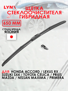 Щетка стеклоочистителя гибридная, 650мм LYNXauto LX650. Для: HONDA Хонда Accord(Аккорд) 03>, LEXUS ЛЕКСУС RX 03-08, MAZDA(Мазда) 2 07> / 5, NISSAN НИССАН Maxima(A33) 00> / Primera(P12), SUZUKI Сузуки SX4, TOYOTA Тойота Celica(Целика) 99-05 / Prius(Приус)