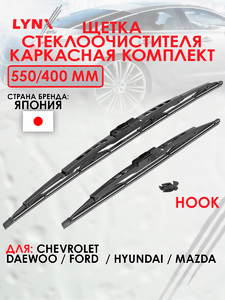 Щетка стеклоочистителя каркасная,комплект 550/400мм (hook) LYNXauto 5540LR для CHEVROLET Aveo 07>/Kalos 05>,DAEWOO Kalos 02>,FORD Fiesta V 01-08/Fusion 02>,HYUNDAI Accent III 05>/i10(PA/BA) 08>/MatrIx 01-10,KIA Picanto(BA/TA) 04>/Rio II 05>,MAZDA 2(DL) 14