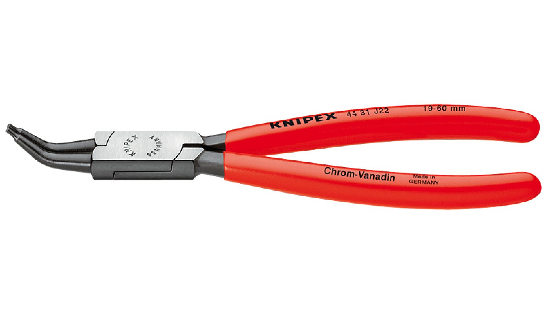 44 31 J42 Щипцы для стопорных колец прочные, кованые. нескользящие, прочные наконечники. В соответствии со стандартом DIN 5256 С и DIN 5256 D, но изогнуты под углом 45°. - Диапазон диаметров отверстий: Ø 85 – 140mm - Наконечники (диаметр): Ø 3,2mm