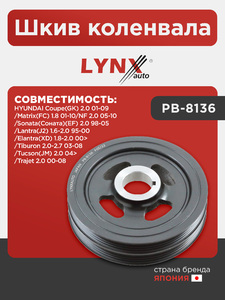 Шкив коленвала LYNXauto PB-8136. Для HYUNDAI Хендаи Coupe(GK) 2.0 01-09/Elantra(Элантра)(XD) 1.8-2.0 00>/Lantra(J2) 1.6-2.0 95-00/Matrix(FC) 1.8 01-10/NF 2.0 05-10/Sonata(Соната)(EF) 2.0 98-05/Tiburon 2.0-2.7 03-08/Trajet 2.0 00-08/Tucson(Туксон)(JM) 2.0 04>