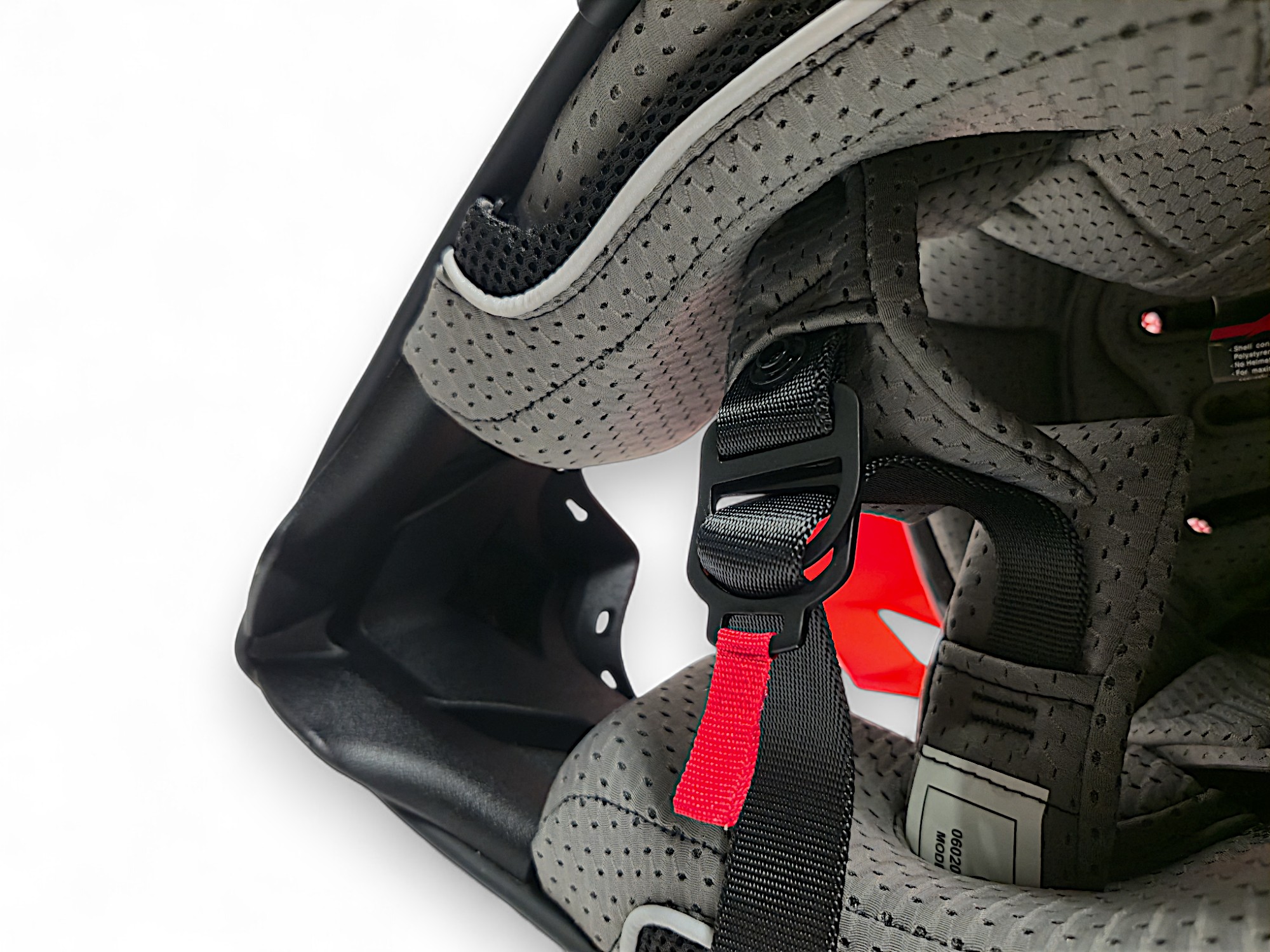- Double-D (D-образная) застёжка — надёжная, прочная и устойчивая к самопроизвольному расстёгиванию. Обеспечивает безопасную и точную фиксацию шлема.