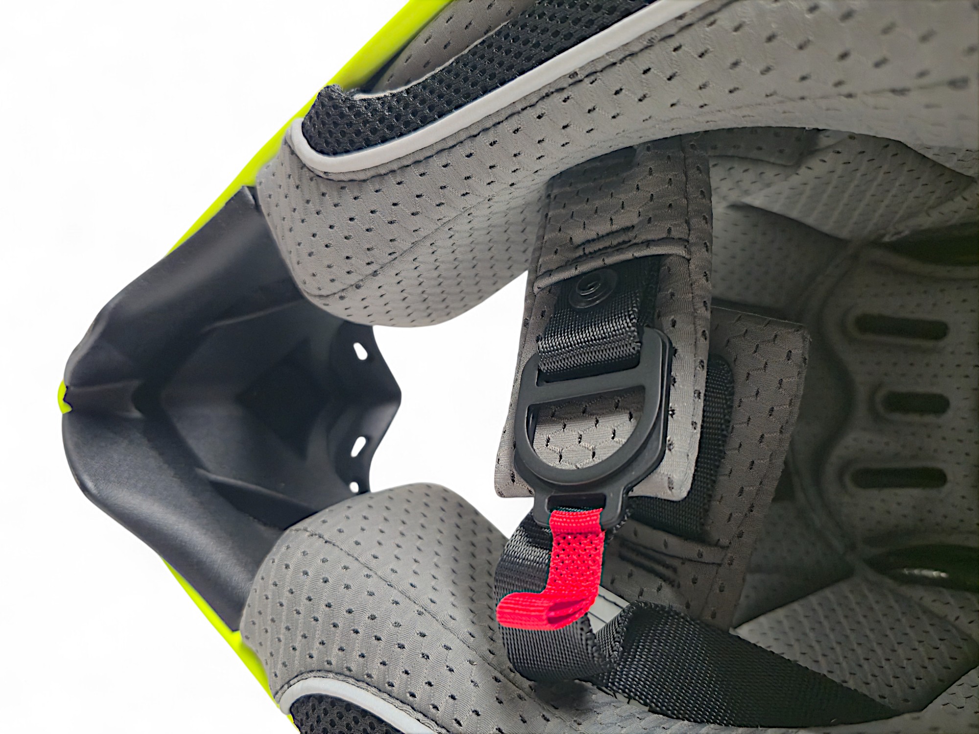 - Double-D (D-образная) застёжка — надёжная, прочная и устойчивая к самопроизвольному расстёгиванию. Обеспечивает безопасную и точную фиксацию шлема.