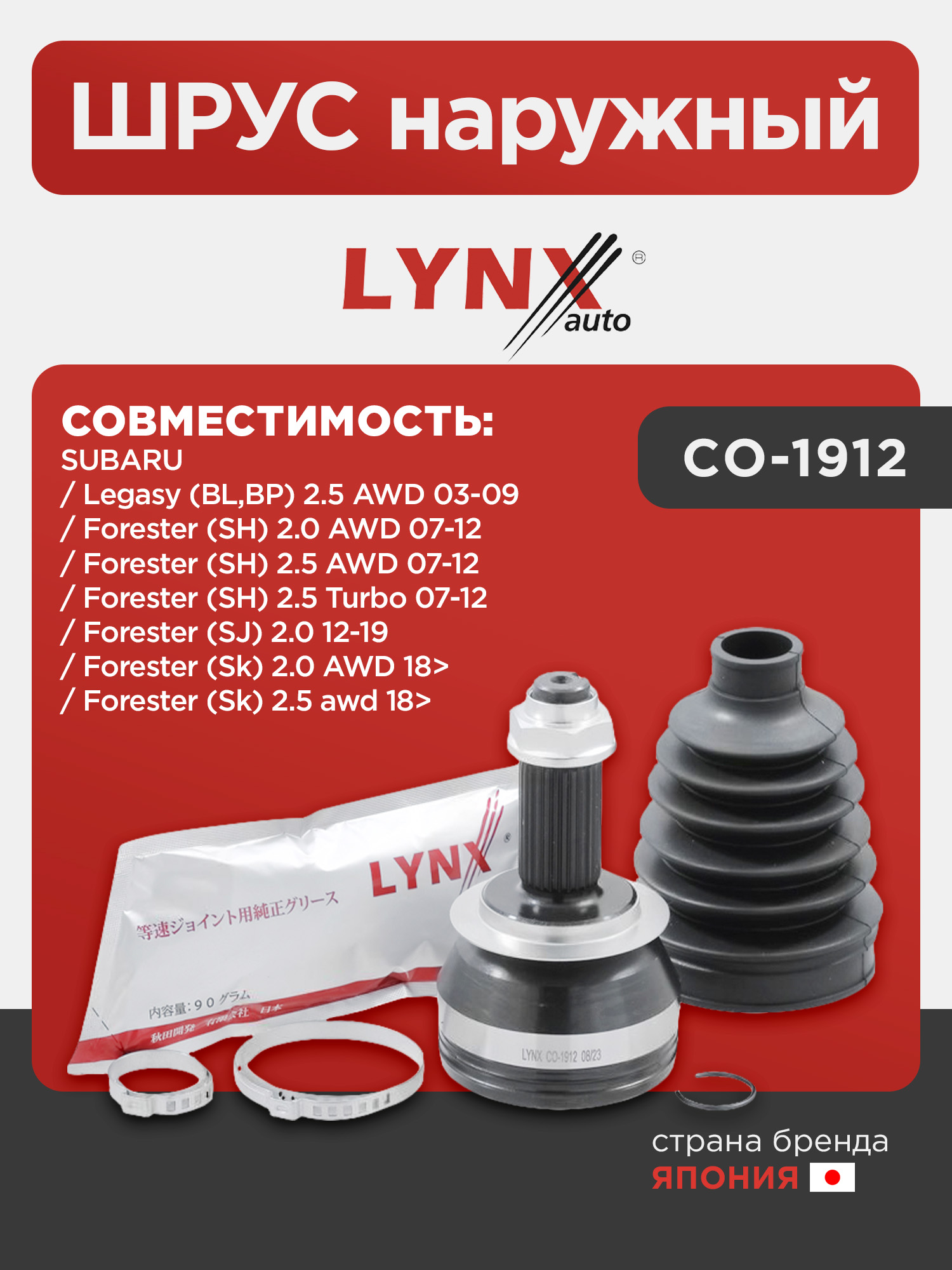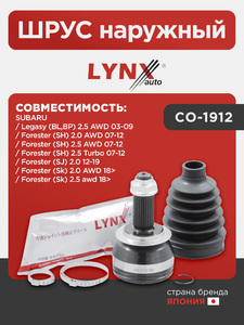 ШРУС наружный LYNXauto CO-1912. Для: SUBARU Legasy (BL,BP) 2.5 AWD 03-09 / Forester (SH) 2.0 AWD 07-12 / Forester (SH) 2.5 AWD 07-12 / Forester (SH) 2.5 Turbo 07-12 / Forester (SJ) 2.0 12-19 / Forester (Sk) 2.0 AWD 18> / Forester (Sk) 2.5 awd 18>