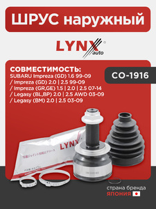 ШРУС наружный LYNXauto CO-1916. Для SUBARU Impreza (GD) 1.6 99-09 / Impreza (GD) 2.0 99-09 / Impreza (GD) 2.5 99-09 / Impreza (GR,GE) 1.5 07-14 / Impreza (GR,GE) 2.0 07-14 / Impreza (GR,GE) 2.5 07-14 / Legasy (BL,BP) 2.0 AWD 03-09 / Legasy (BL,BP) 2.5 AWD