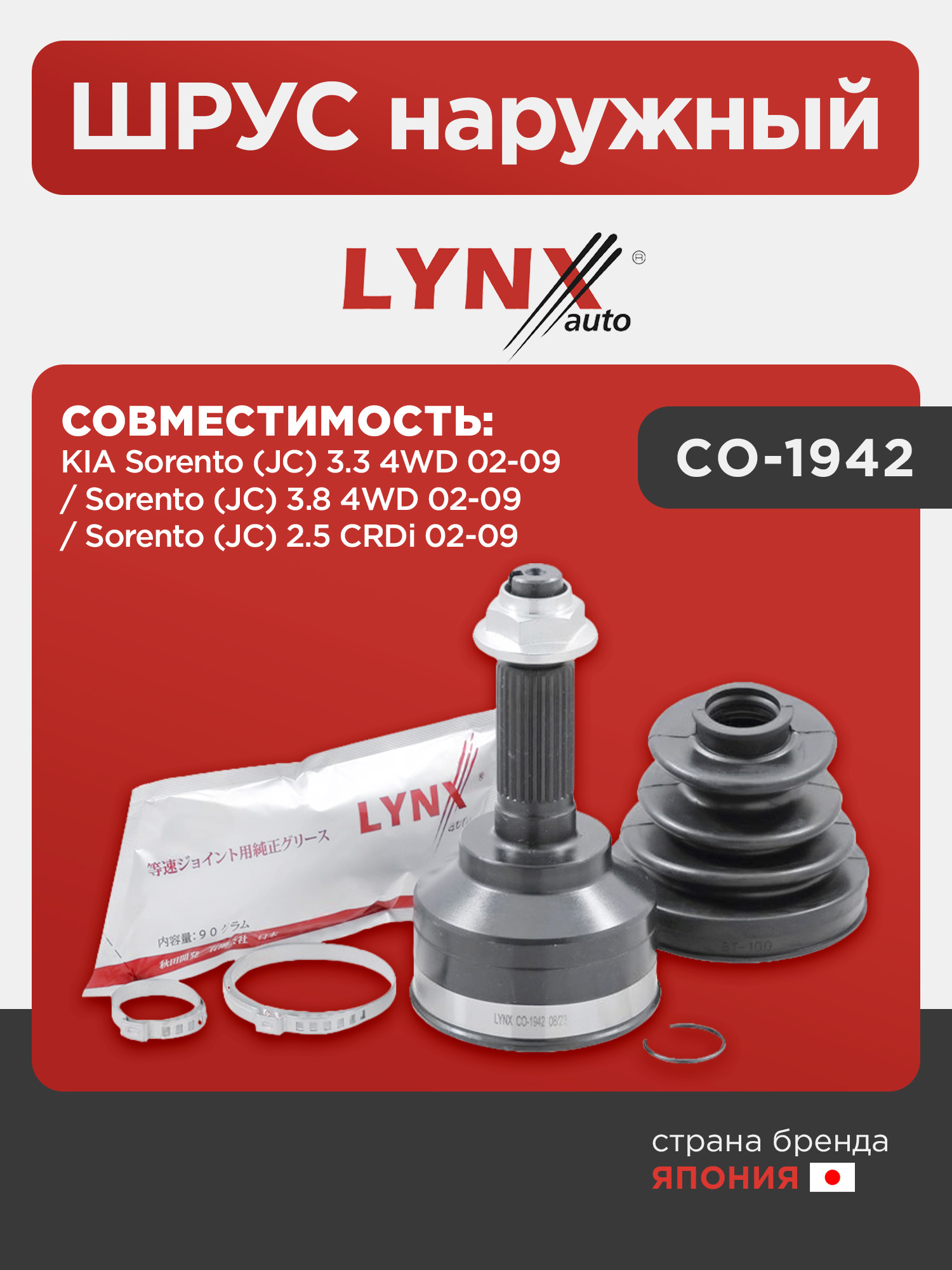 ШРУС наружный LYNXauto CO-1942. Для: KIA Sorento (JC) 3.3 4WD 02-09 / Sorento (JC) 3.8 4WD 02-09 / Sorento (JC) 2.5 CRDi 02-09