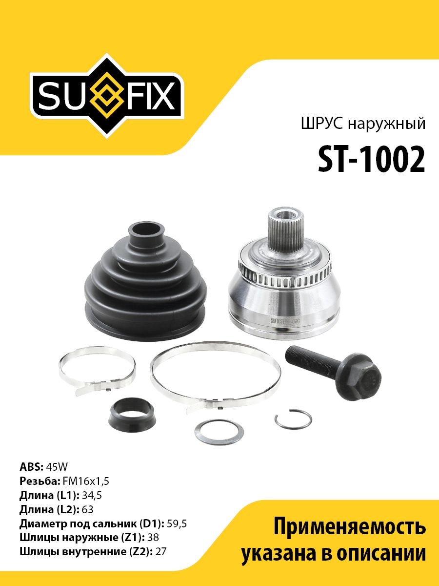 ШРУС наружный SUFIX ST-1002. Применение: AUDI A4 1.8-2.8 95-00/A6 1.9TD-4.2 97-05/A8 2.5TD-6.0 97-02/Allroad 2.5TD-4.2 00-05, SKODA Superb 1.8-2.8 02-08, VW Passat 1.9TD-2.8 96-00/1.8-4.0 00-05.
