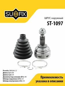 ШРУС наружный SUFIX ST-1097. Применение: RENAULT Logan I 1.5D-1.6 06> / Sandero I 1.5D 10> / Clio III 1.6 05> / Megane II 1.4-1.6 03>, NISSAN Almera 1.6 12>.