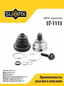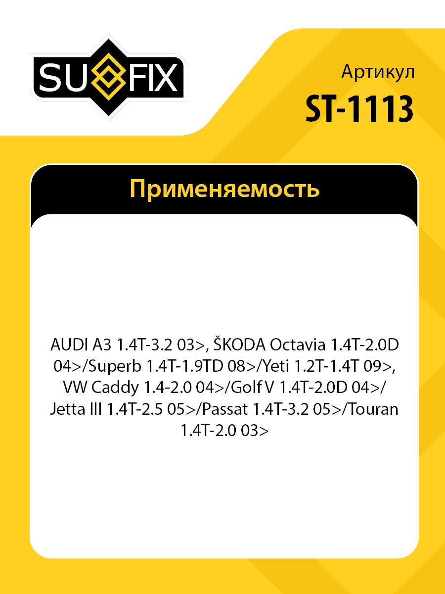 ШРУС наружный SUFIX ST-1113. Применение: AUDI A3 1.4T-3.2 03>, SKODA Octavia 1.4T-2.0D 04> / Superb 1.4T-1.9TD 08> / Yeti 1.2T-1.4T 09>, VW Caddy 1.4-2.0 04> / Golf V 1.4T-2.0D 04> / Jetta III 1.4T-2.5 05> / Passat 1.4T-3.2 05> / Touran 1.4T-2.0 03> .