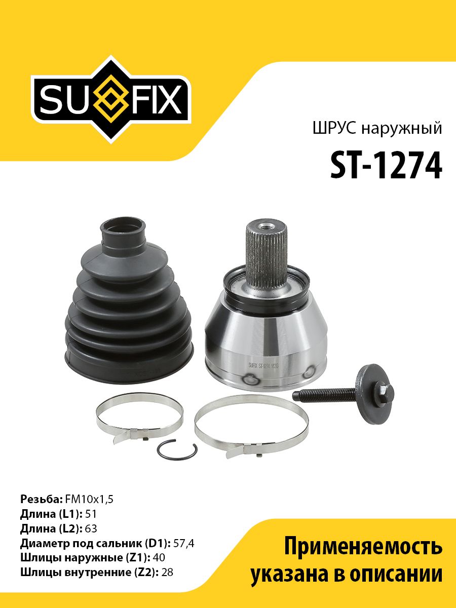 ШРУС наружный SUFIX ST-1274. Применение: FORD Mondeo IV 1.6-2.0D 07-14 / Galaxy/S-Max 1.6-2.2D 06-15, VOLVO S60 II 1.6-1.6D 10> / S80 II 1.6-2.0D 08>.