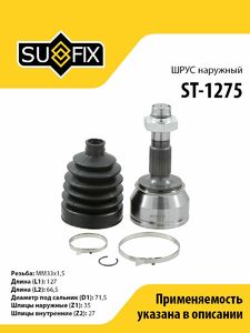 ШРУС наружный SUFIX ST-1275. Применение: CITROEN Jumper 2.2D 06>, FIAT Ducato 2.2D 06>, PEUGEOT Boxer 2.2D 06>.