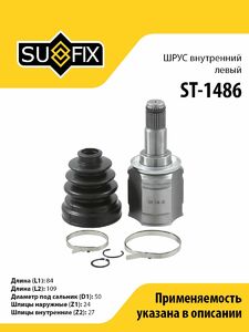 ШРУС внутренний L SUFIX ST-1486. Применение: TOYOTA Camry(V30) 2.4-3.0 01-06 / (V40) 2.4 06-11 / (V50) 2.5 11> / RAV 4 2.0-3.5 05-12 / Ipsum 2.4 01-09 / Estima/Previa II 2.4 00-05 / Alphard 2.4-3.0 02> / Harrier 3.0 03-12.