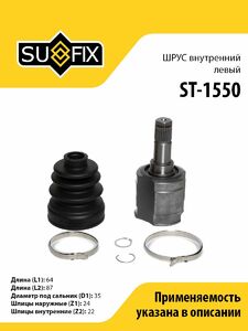 ШРУС внутренний L SUFIX ST-1550. Применение: KIA Spectra 1.6 01-04.