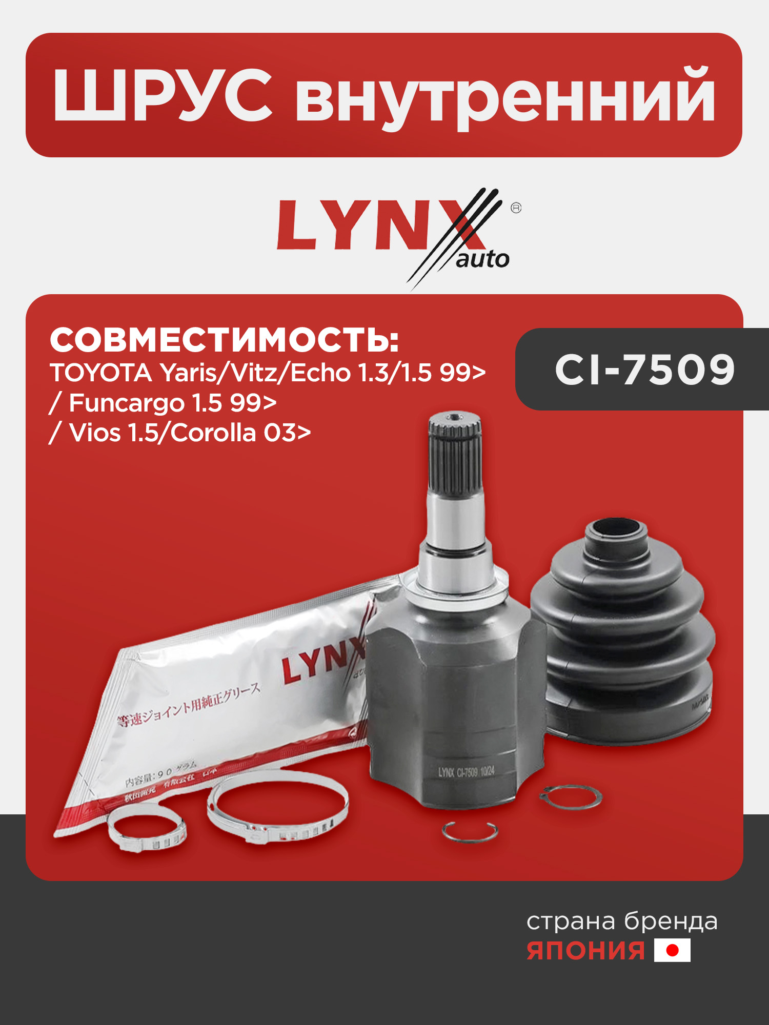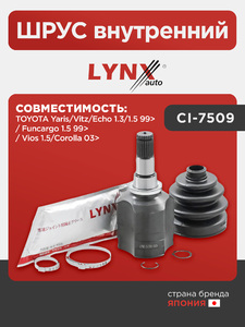 ШРУС внутренний LYNXauto CI-7509. Для: TOYOTA Yaris/Vitz/Echo 1.3/1.5 99> / Funcargo 1.5 99> / Vios 1.5/Corolla 03>