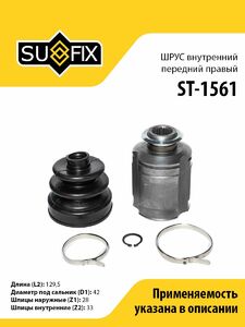 ШРУС внутренний передний R SUFIX ST-1561. Применение: HYUNDAI Santa Fe(DM) III 2.4 12-19, KIA Sorento(XM) 2.4 09-15.