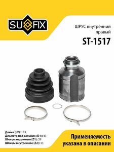 ШРУС внутренний R SUFIX ST-1517. Применение: MAZDA CX-5(KE) 2.0 11-17 / CX-7 2.2D-2.5 06-12 / 6(GG/GH) 2.0-2.5 02-12 / MPV/LW 02-06 / Tribute 2.3-3.0 04-08.