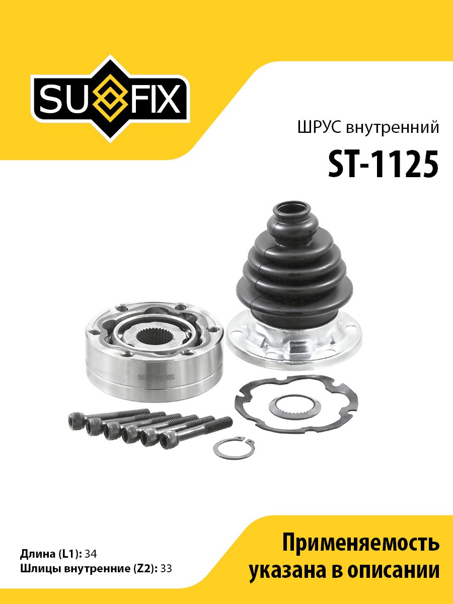 ШРУС внутренний SUFIX ST-1125. Применение: AUDI A4 1.8-2.8 95-00 / 80 2.0-2.8 92-94/A3 1.8-1.9TD 96> / 1.4T-3.2 03>, SKODA Fabia 1.6 07> / Octavia 1.8-2.0 99> / 1.4T-2.0 04> / Superb 1.4T-1.9TD 08>, VW Golf II-IV 1.8-2.8 >06/V-VI 1.4T-2.0D 03> / Jetta III 1.4T-2.5 05> / Passat 1.6-2.0 >93/1.4T-3.6 05> / Tiguan 1.4T-2.0 07> / Touran 1.4T-2.0 03>.