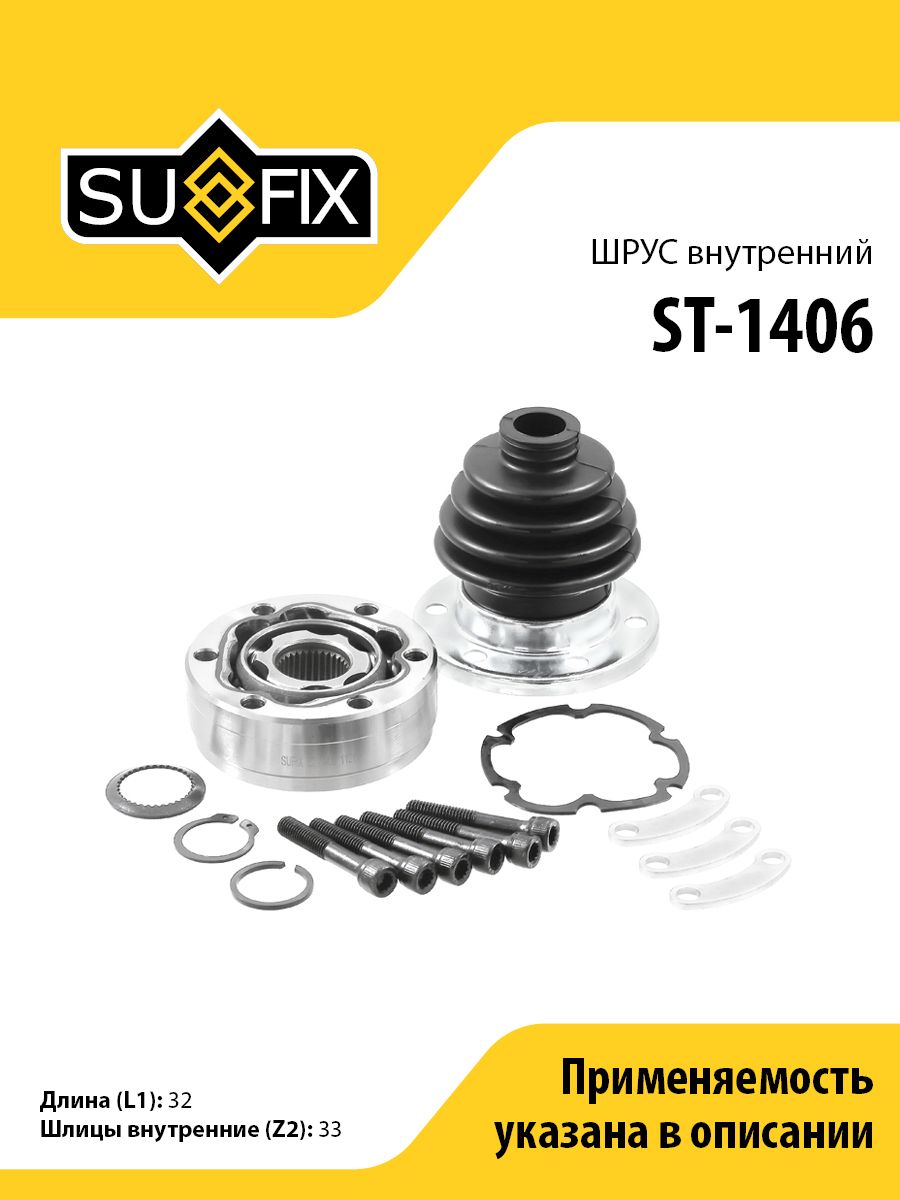 ШРУС внутренний SUFIX ST-1406. Применение: AUDI 80 2.3 91-96 / A2 1.4-1.6, SKODA Fabia I-II 1.2-1.9D 99-14 / Octavia(1U) 1.4-1.9D 96-10 / Roomster 1.2-1.4 06-15, VW Bora 1.4 98-05 / Golf III-IV 1.4-1.9D 91-05 / Passat 1.6D-1.8 88-97 / Polo(9N) 1.2-1.9D 01-10 / Vento 1.6 91-98.