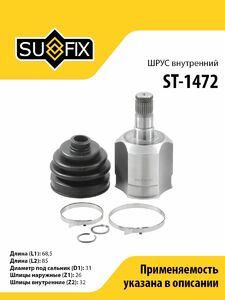 ШРУС внутренний SUFIX ST-1472. Применение: AUDI A3 1.6-2.0 03-12, SKODA Octavia(1Z) 2.0 04-12 / Yeti 1.6 09-18, VW Golf V-VI 1.6-2.0 03-08 / Jetta 1.6-2.0 1.6-2.0 / Passat 2.0 05-10 / Touran 2.0 03-10.