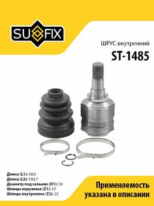 ШРУС внутренний SUFIX ST-1485. Применение: TOYOTA Yaris(P10) 1.3 99-05 / Yaris Verso 1.3 99-05 / Vitz(P10/P90/P130) 1.3 99> / Will 1.3 00-05.