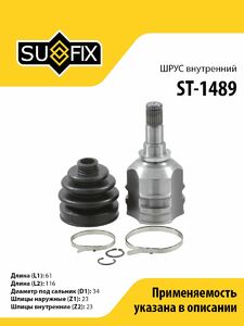 ШРУС внутренний SUFIX ST-1489. Применение: TOYOTA Carina E(T19) 1.6-1.8 92-95 / Caldina(T19/T21) 1.5-.18 92-02 / Corolla(E100/E110 / E120) 1.3-1.6 91-06 / Vitz(P10/P90) 1.3 99-10.