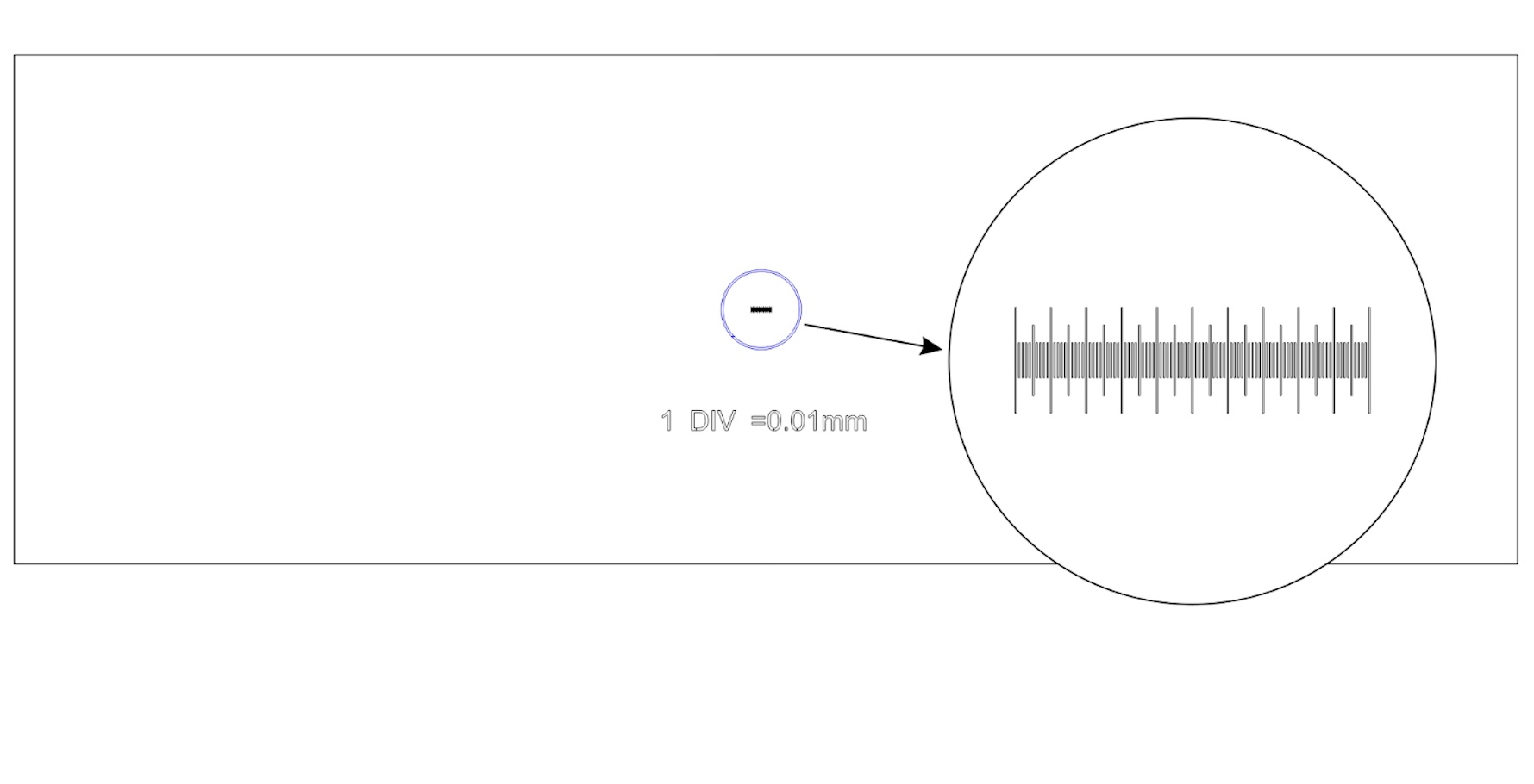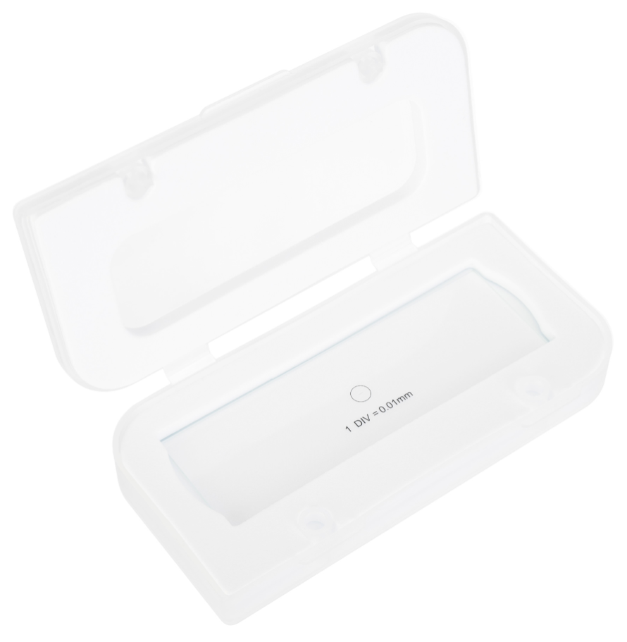 Калибровочный слайд MAGUS CS1 (0,01) – это прозрачное стекло стандартного размера с нанесенной на него горизонтальной микрометрической шкалой. Шкала имеет 100 делений, цена деления составляет 0,01 мм.