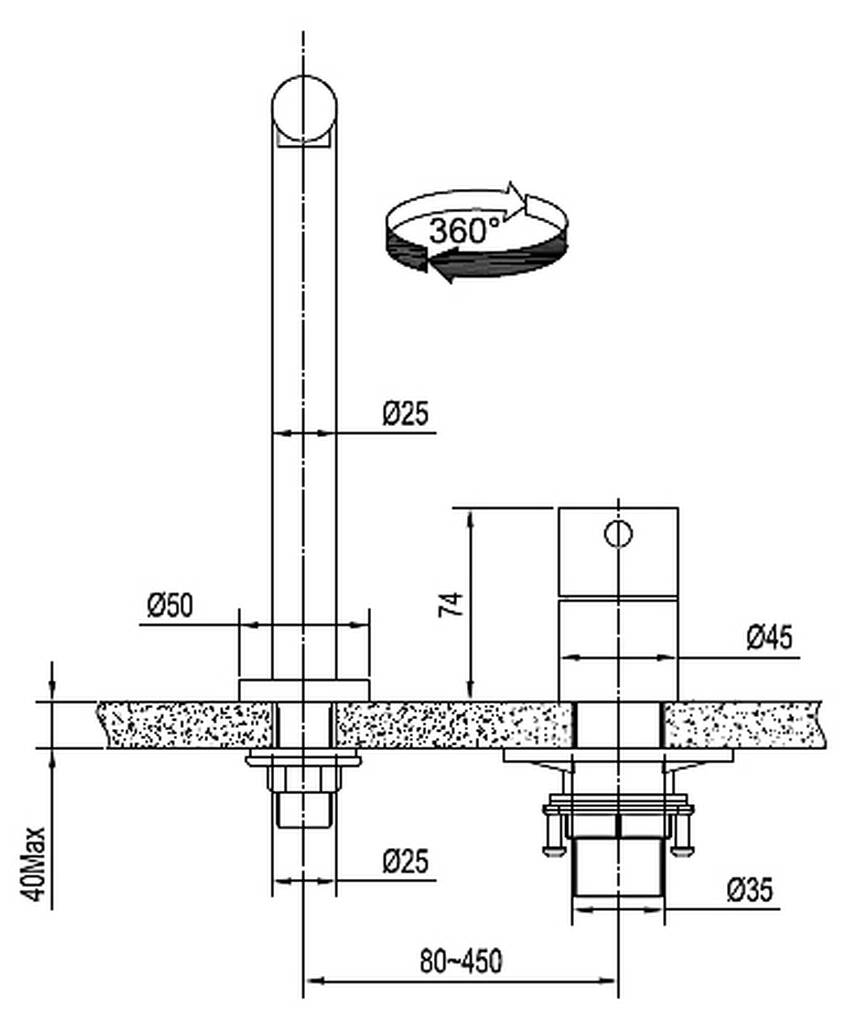 Высота излива: 230 мм. Длина излива (вынос): 225 мм.