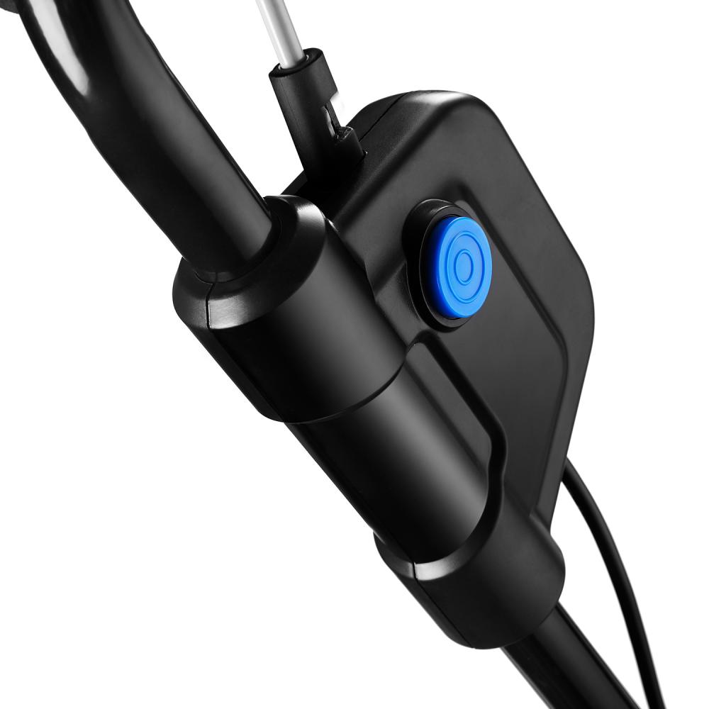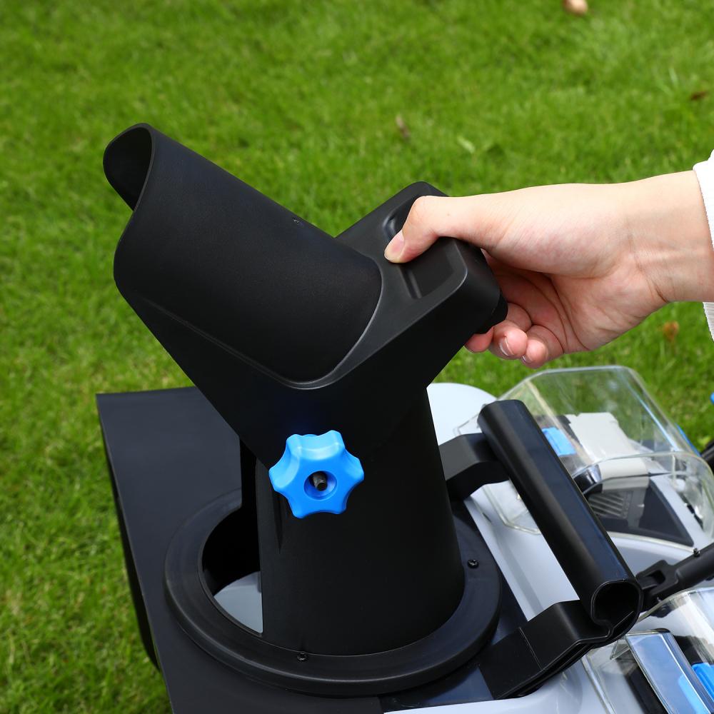 Телескопическая ручка и две точки хвата (основная и дополнительная) обеспечивают комфортную посадку под рост пользователя и точный контроль над направлением выброса снега. Жёлоб поворотный, состоит из двух частей для удобной сборки.