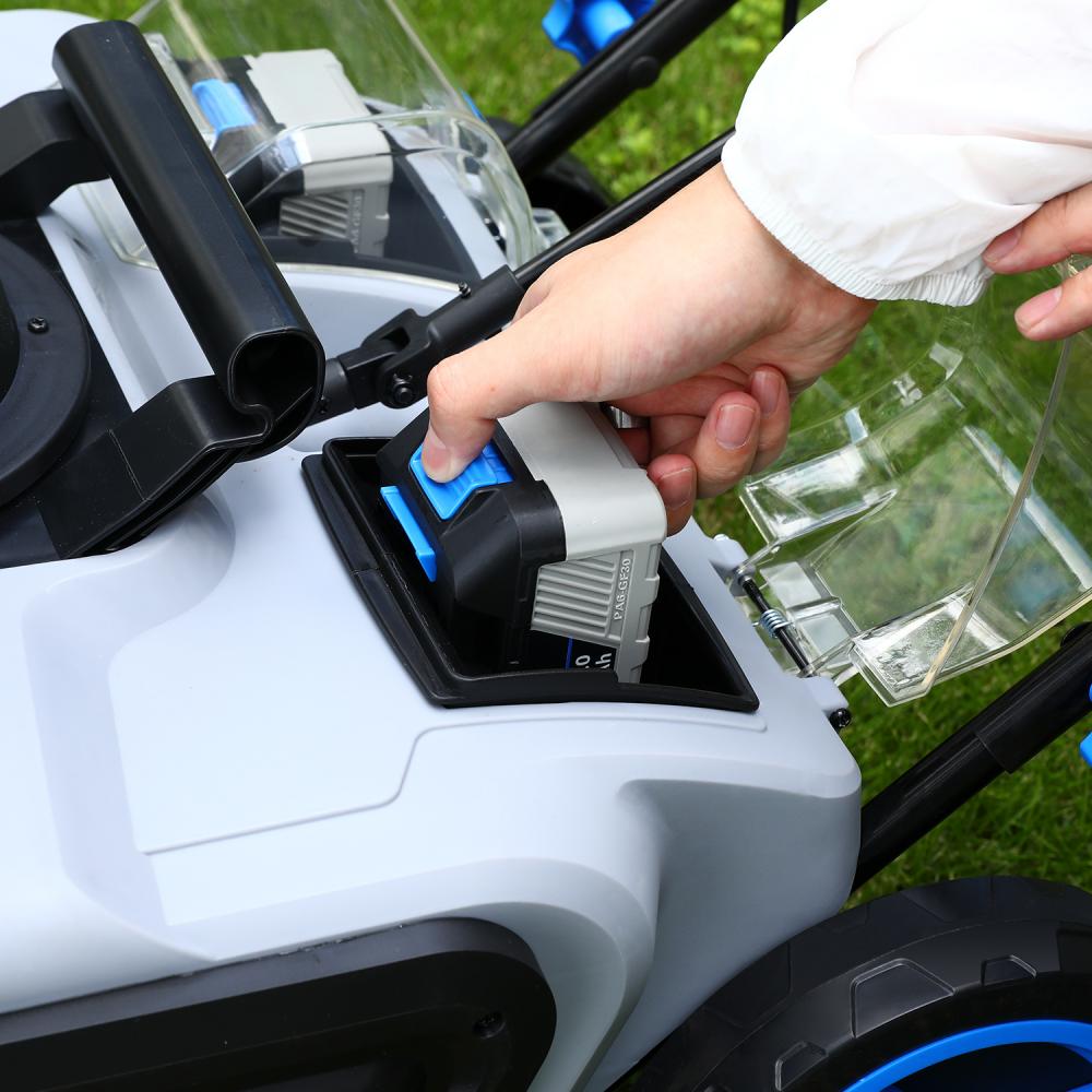 Модель работает от двух литий-ионных аккумуляторов 20 В / 5.0 А·ч (всего 40 В в последовательном подключении), что обеспечивает высокую мощность и продолжительное время работы без перерыва на подзарядку. Аккумуляторы обладают повышенной токоотдачей, что особенно важно при старте и работе в плотном снегу.