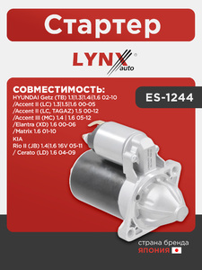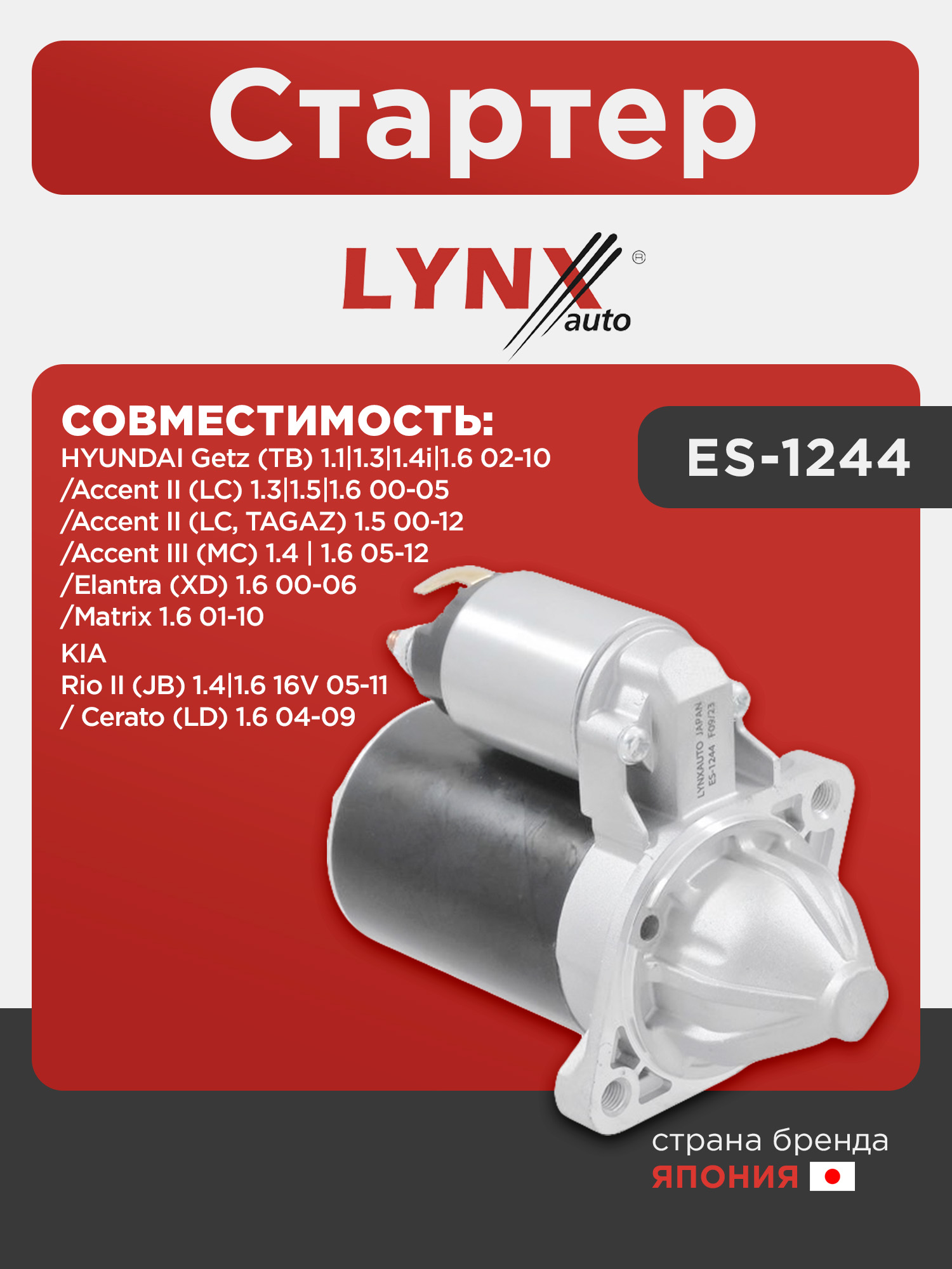 Стартер LYNXauto ES-1244. Для HYUNDAI Хендаи Accent(Акцент) II (LC) 1.3 00-05/Accent(Акцент) II (LC) 1.5 00-05/Accent(Акцент) II (LC) 1.6 00-05/Accent(Акцент) II (LC, TAGAZ) 1.5 00-12/Accent(Акцент) III (MC) 1.4 05-12/Accent(Акцент) III (MC) 1.6 05-12/Elantra(Элантра) (XD) 1.6 00-06/Getz (TB) 1.1 02-10/Getz (TB) 1.3 02-10/Getz (TB) 1.4i 02-10/Getz (TB) 1.6 02-10/Matrix 1.6 01-10, KIA Киа Cerato(Церато) (LD) 1.6 04-09/Rio(Рио) II (JB) 1.4 16V 05-11/Rio(Рио) II (JB) 1.6 16V 05-11