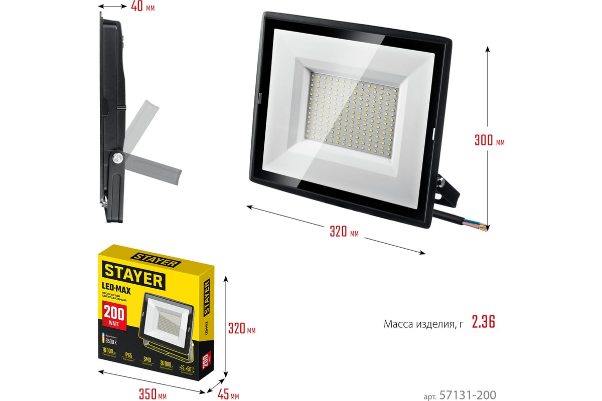 Прожектор светодиодный STAYER 57131-200, предназначен для наружного освещения на открытых строительных и производственных площадках.
