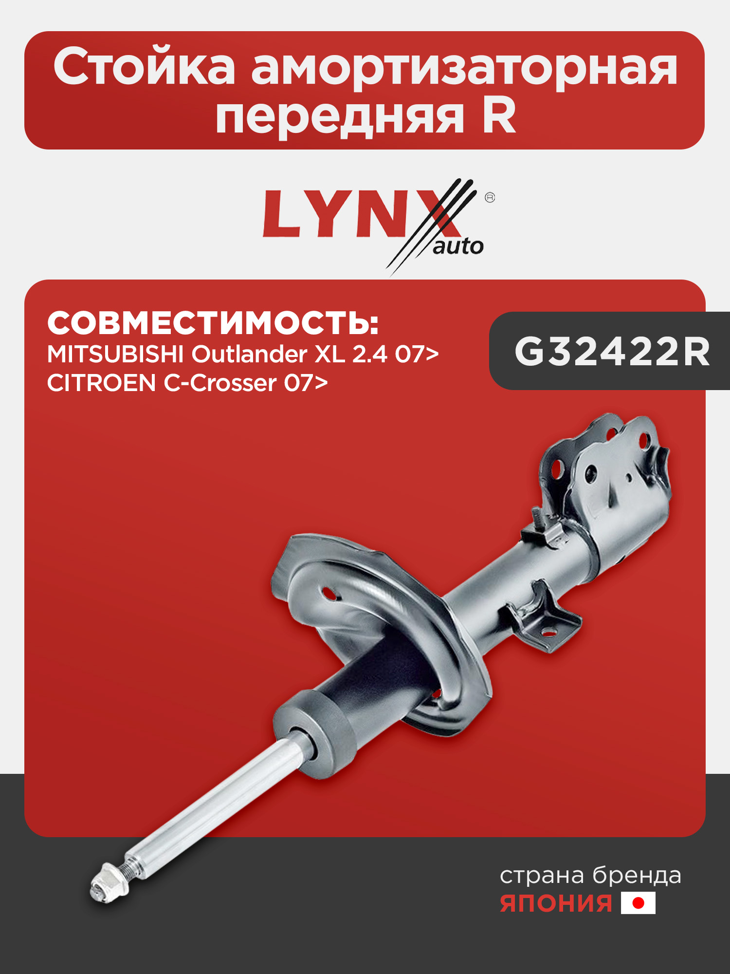 Стойка амортизаторная передняя R LYNXauto G32422R. Для MITSUBISHI Митсубиси Outlander(Аутлэндер) XL 2.4 07>, CITROEN Ситроен C-Crosser(Ц Кроссер) 07>