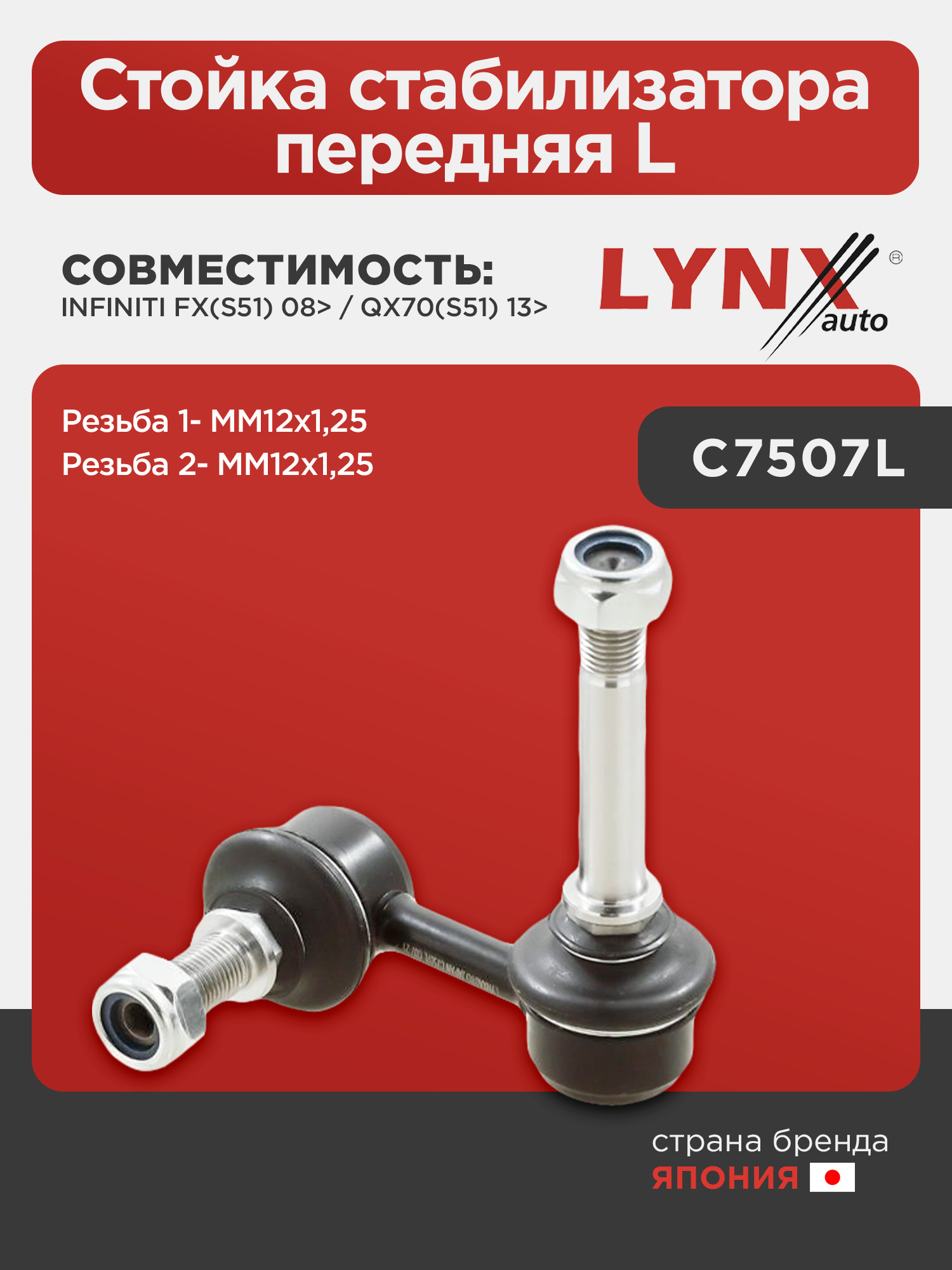 Стойка стабилизатора передняя L LYNXauto C7507L. Для: Infiniti, Инфинити, FX(S51) 08> / QX70(S51) 13>. Резьба 1- MM12x1,25. Резьба 2- MM12x1,25.