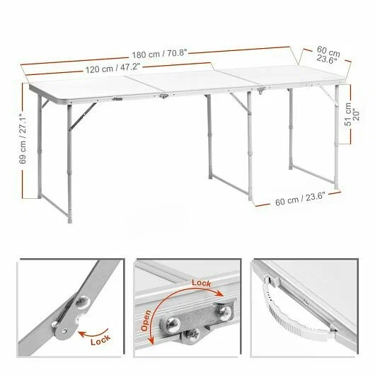 Туристический складной стол NISUS, состоящий из 3 секций и отличающийся внушительными размерами: 180х60х70 см. Его можно использовать для организации выездов всей семьей на природу, для организации банкетов под открытым воздухом, для комфортного отдыха большой компанией. Для транспортировки у стола имеется удобная ручка. Характеристики: • Размер стола: 180х60х70 см (в рабочем состоянии); 62,4х62х10,5 см (в сложенном виде).