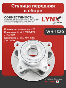Ступица передняя в сборе LYNXauto WH-1320. Применение: LAND ROVER Discovery III-IV 2.7D-5.0 04> / Range Rover Sport I 2.7D-5.0 05-13. Количество шлицев, шт. - 29. Крепление 1 - x4 / FM12x1,75 / PCD 130. Крепление 2 - x5 / MM14x1,5 / PCD 120.