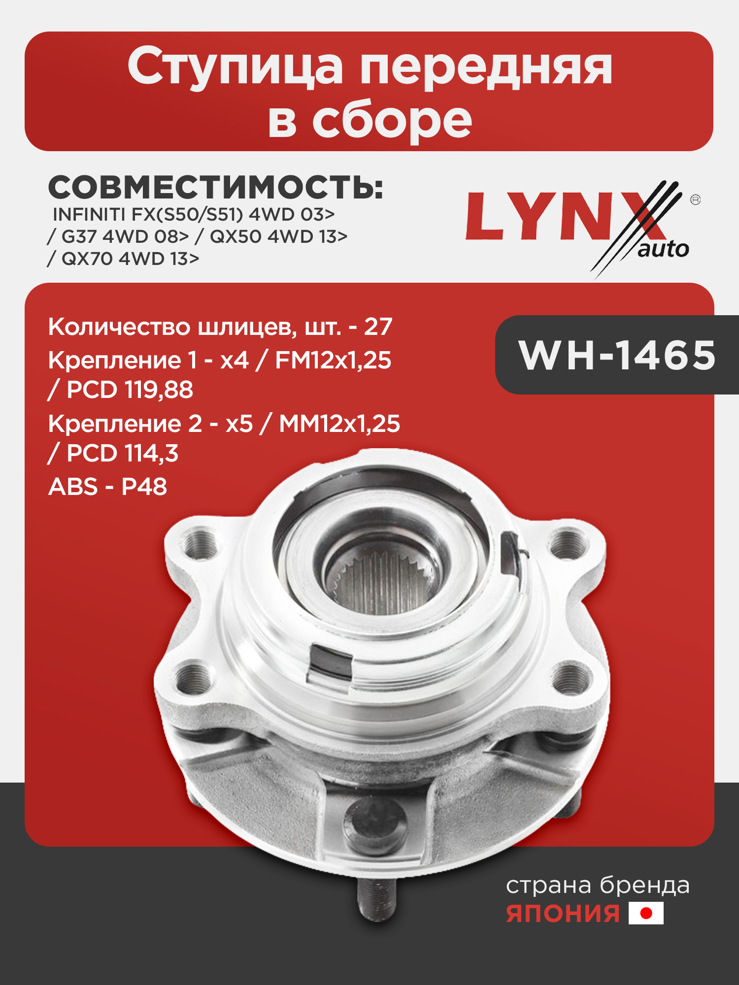 Ступица передняя в сборе LYNXauto WH-1465. Применение: INFINITI FX(S50/S51) 4WD 03> / G37 4WD 08> / QX50 4WD 13> / QX70 4WD 13>. Количество шлицев, шт. - 27. ABS - P48. Крепление 1 - x4 / FM12x1,25 / PCD 119,88. Крепление 2 - x5 / MM12x1,25 / PCD 114,3.