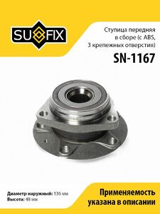 Ступица передняя в сборе (с ABS, 3 крепежных отверстия) SUFIX SN-1167. Применение: AUDI A3 1.0-2.0 12> / TT 1.8-2.5 14>, SKODA Octavia(5E) 1.0-2.0 12> / Superb(3V) 1.4-2.0 15>, VW Golf VII 1.0-2.0 12> / Passat 1.4-2.0 14>.