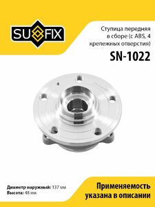 Ступица передняя в сборе (с ABS, 4 крепежных отверстия) SUFIX SN-1022. Применение: AUDI A3 1.2T-3.2 03-12 / Q3 2.0-2.0D 11> / TT 1.8-3.2 08>, SKODA Octavia(1Z) 1.2T-2.0D 04> / Superb 1.4T-3.6 08> / Yeti 1.2T-2.0D 09>, VW Caddy III 1.2T-2.0D 04> / Golf V-VI 1.4-3.2 03> / Jetta 1.4T-2.5 05> / Passat 1.4T-3.6 05> / Sharan 1.4T-2.0D 10> / Tiguan 1.4T-2.0D 08> / Touran 1.4-2.0D 03>, SEAT Alhambra 1.4T-2.0D 10> / Altea 1.4-2.0D 04> / Leon 1.2T-2.0 05> / Toledo 1.6-2.0D 04-09.