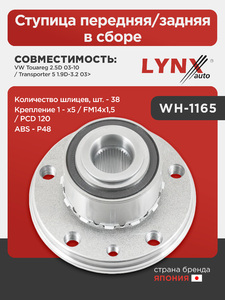 Ступица передняя/задняя в сборе LYNXauto WH-1165. Применение: VW Touareg 2.5D 03-10 / Transporter 5 1.9D-3.2 03>. Количество шлицев, шт. - 38.
