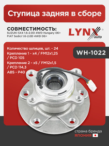 Ступица задняя в сборе LYNXauto WH-1022. Для: Suzuki, Сузуки, SX4 1.6-2.0D 4WD Hungary 06>, Fiat, Фиат, Sedici 1.6-2.0D 4WD 06>. Количество шлицев, шт. - 24. ABS - P40. Крепление 1 - x4 / FM12x1,25.
