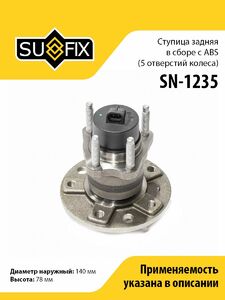 Ступица задняя в сборе с ABS (5 отверстий колеса) SUFIX SN-1235. Применение: OPEL Astra G 1.8-2.2D 98-05 / Combo 1.7D 04> / Meriva 1.3D-1.7D 03-10 / Vectra A 2.5 93-95 / B 1.6-2.6 95-02 / Zafira A 1.6-2.2D 99-05, SAAB 900 2.0-2.5 89-98 / 9-3 2.0-2.3T 98-02.