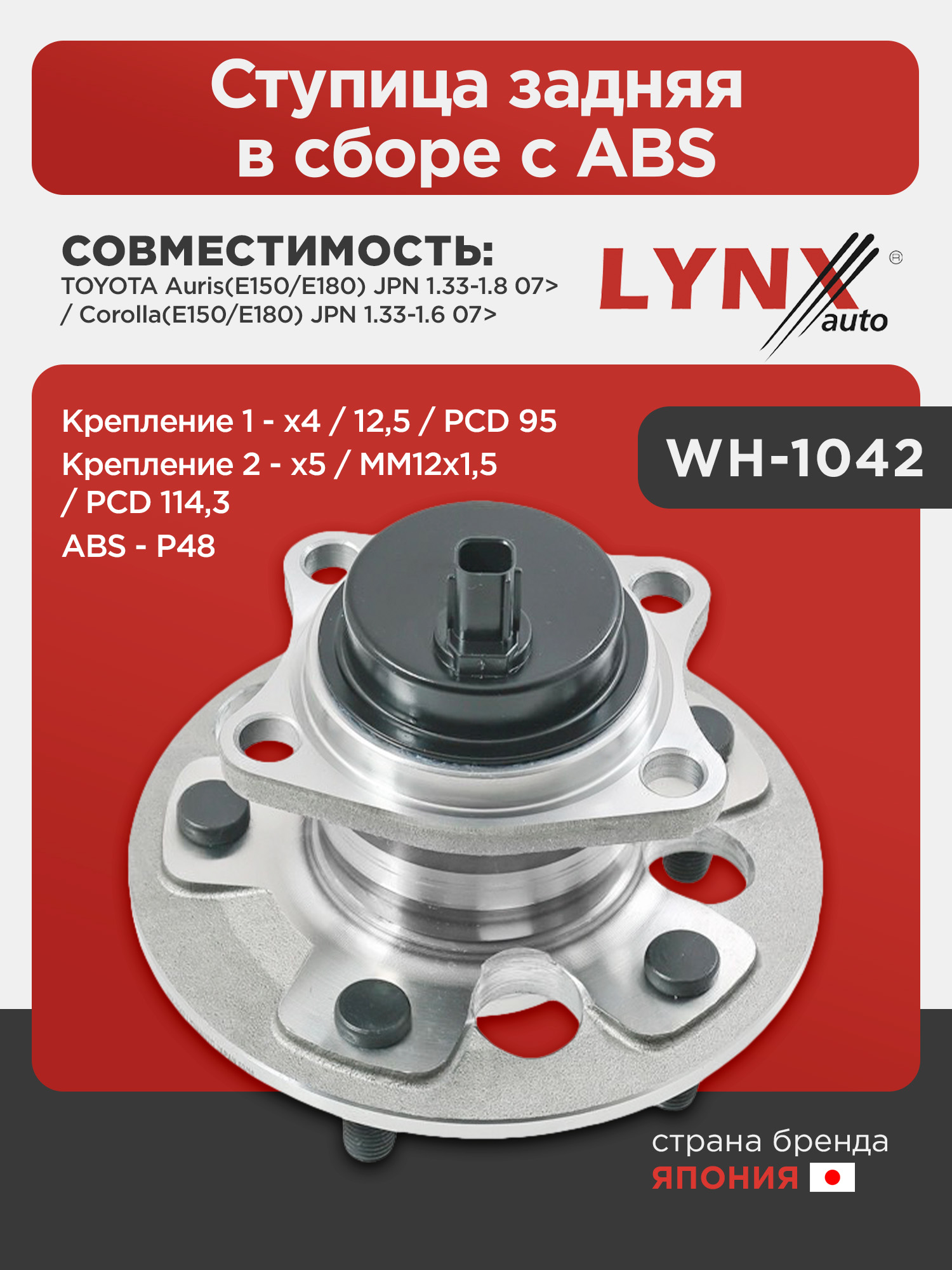 Ступица задняя в сборе с ABS LYNXauto WH-1042. Применение: TOYOTA Auris(E150/E180) JPN 1.33-1.8 07> / Corolla(E150/E180) JPN 1.33-1.6 07> . ABS - P48. Крепление 1 - x4 / 12,5 / PCD 95. Крепление 2 - x5 / MM12x1,5 / PCD 114,3.
