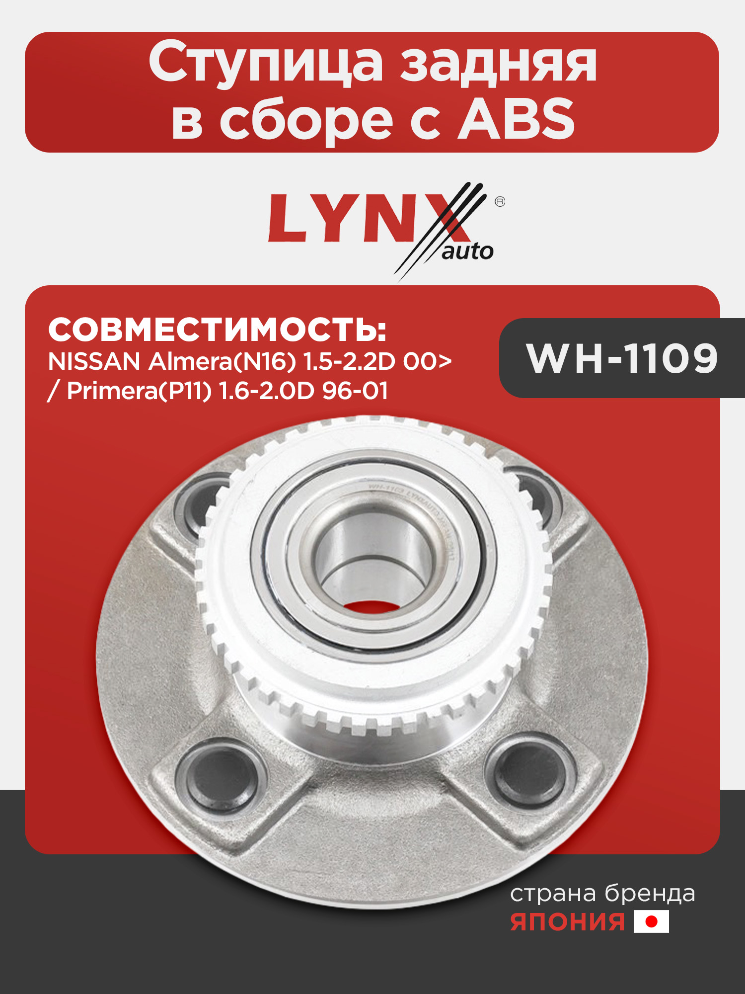 Ступица задняя в сборе с ABS LYNXauto WH-1109. Для: NISSAN НИССАН Almera(Алмера)(N16) 1.5-2.2D 00> / Primera(P11) 1.6-2.0D 96-01