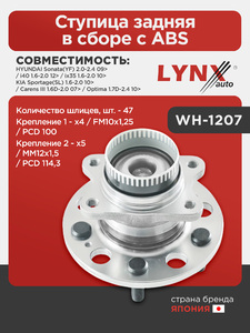 Ступица задняя в сборе с ABS LYNXauto WH-1207. Применение: HYUNDAI Sonata(YF) 2.0-2.4 09> / i40 1.6-2.0 12> / ix35 1.6-2.0 10>, KIA Sportage(SL) 1.6-2.0 10> / Carens III 1.6D-2.0 07> / Optima 1.7D-2.4 10>. Количество шлицев, шт. - 47. Крепление 1 - x4 / FM10x1,25 / PCD 100. Крепление 2 - x5 / MM12x1,5 / PCD 114,3.