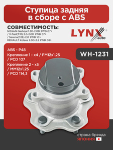 Ступица задняя в сборе с ABS LYNXauto WH-1231. Применение: NISSAN Qashqai 1.5D-2.0D 2WD 07> / X-Trail(T31) 2.0-2.0D 2WD 07> / Serena(C26) 2.0 2WD 10>, RENAULT Koleos 2.0D-2.5 2WD 08>. ABS - P48. Крепление 1 - x4 / FM12x1,25 / PCD 107. Крепление 2 - x5 / MM12x1,25 / PCD 114,3.