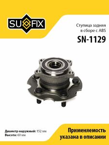 Ступица задняя в сборе с ABS SUFIX SN-1129. Применение: TOYOTA RAV 4 III-IV 2.0-3.5 4WD 06> / Auris(E150/E180) 1.5-1.8 4WD 06>.
